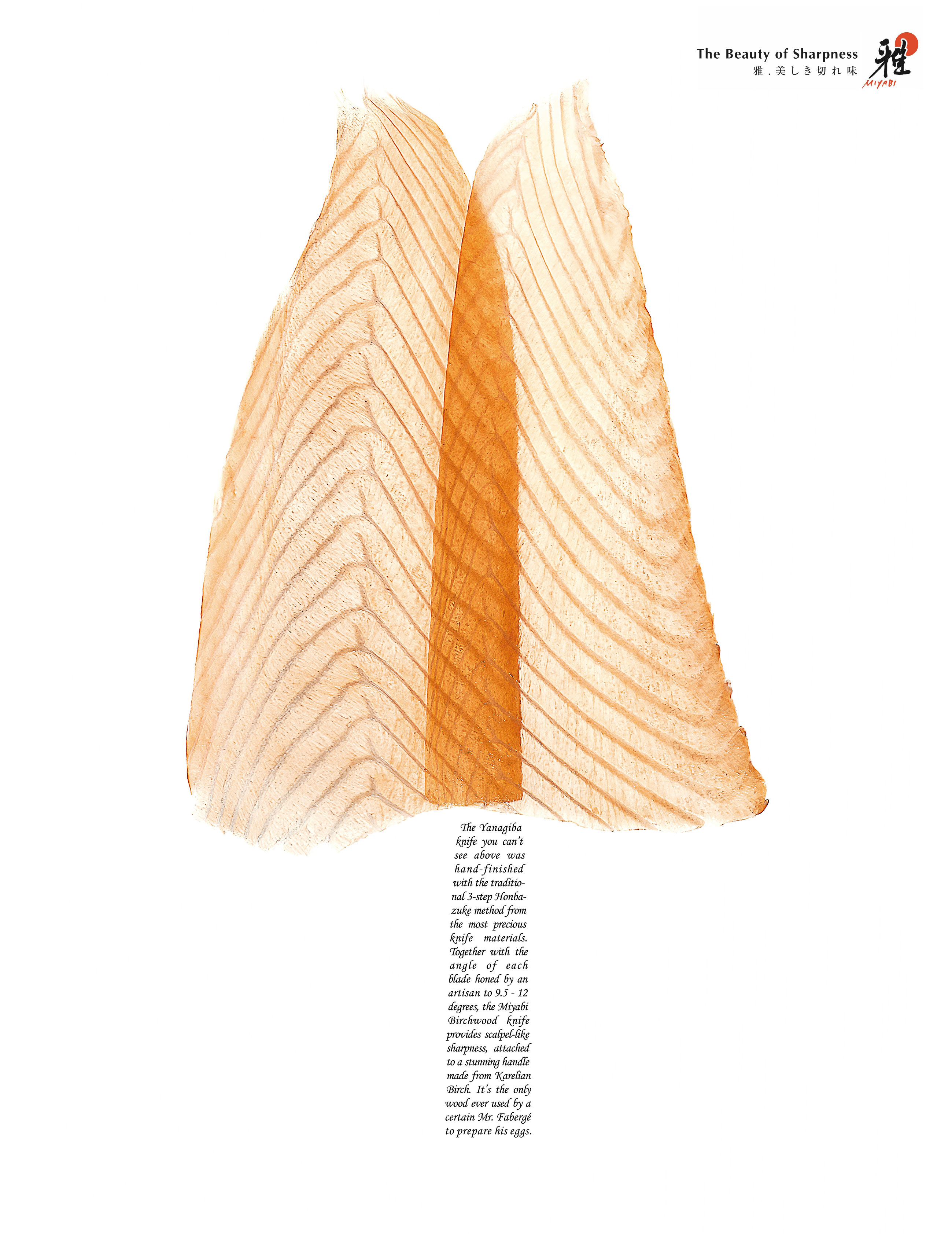 Để tôn vinh độ sắc bén của dao Miyabi một cách trực quan và đầy nghệ thuật, những hình ảnh sản phẩm được xây dựng với ý tưởng độc đáo. Hãy tưởng tượng lưỡi dao Miyabi lướt nhẹ qua những khoanh cá hồi hảo hạng hay những trái dưa căng mọng, để lại phía sau là những lát cắt mỏng tang, đều tăm tắp, gần như trong suốt.