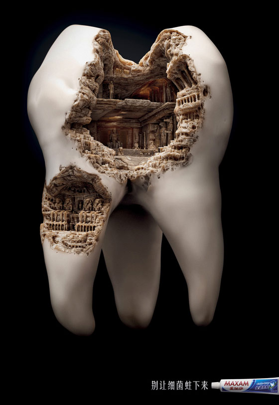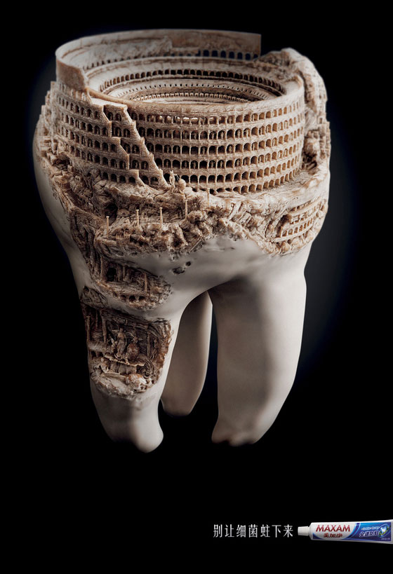 Thương hiệu đồ dùng vệ sinh Maxam Toiletries đã trình bày một luận điểm đầy thuyết phục cho dòng kem đánh răng của mình thông qua hai mẫu quảng cáo báo in mang tên “Nền Văn Minh – Ai Cập” (Civilization-Egypt) và “Nền Văn Minh – La Mã” (Civilization-Rome). Ý tưởng quảng cáo cốt lõi là hình ảnh các di tích cổ đại đang dần bị hủy hoại, được đặt trong bối cảnh những chiếc răng hàm của con người – một phép ẩn dụ trực quan và mạnh mẽ.